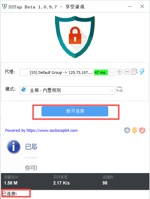 注:查询的IP地址与刚刚代理IP地址一致则显示连接成功